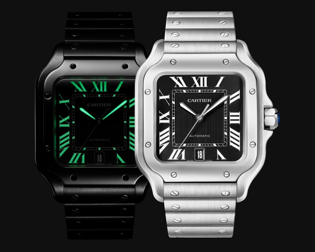Both are housed in the "large" 39.8 mm x 9.3 mm Santos case, water-resistant to 100 m, and are equipped with Cartier’s QuickSwitch system for interchangeable bracelets and straps.