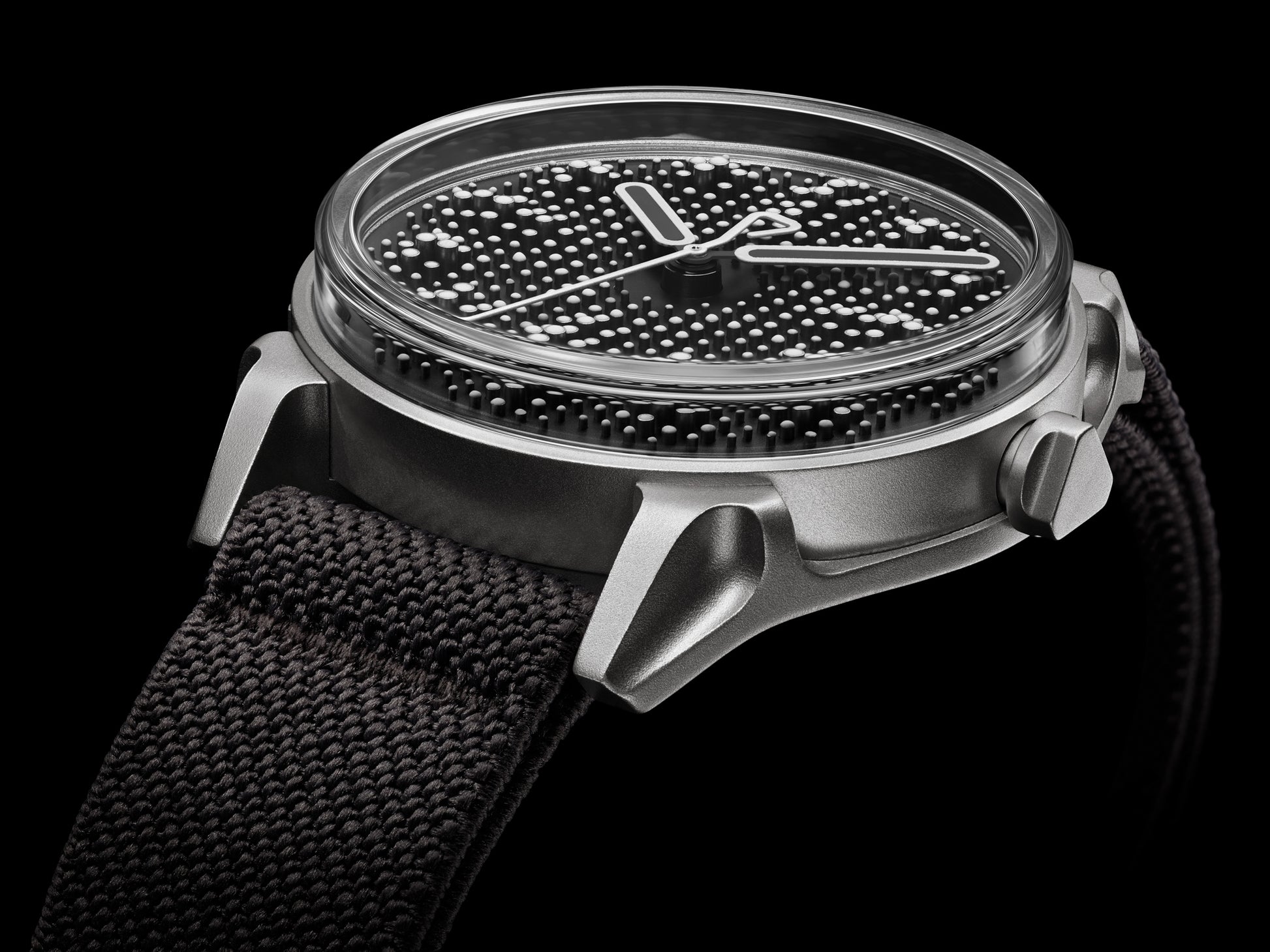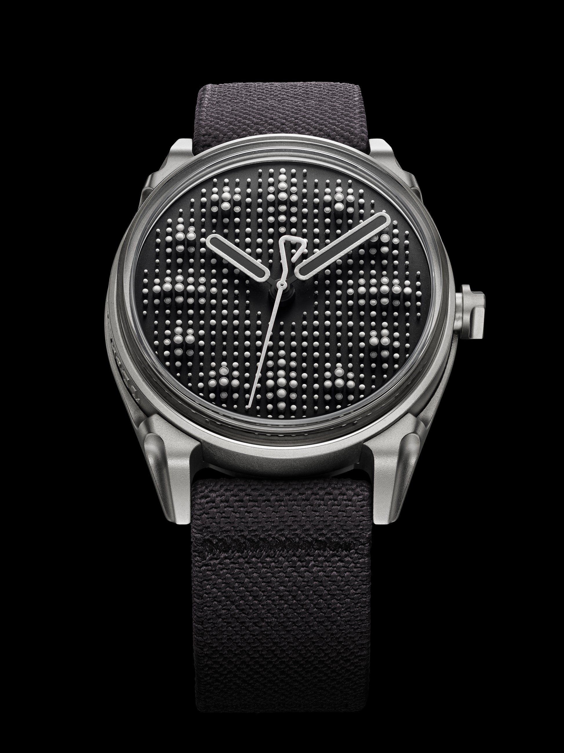 Moreover, its dial is like a visual puzzle if you look closer, composed of 468 hand-applied cylindrical elements that create an intricate, pixelated image. The markers and hands are treated with Super-LumiNova, emitting a special blue glow in the dark, which in my eyes contributes very well to the watch's retro-futuristic, neo-brutalist charm.